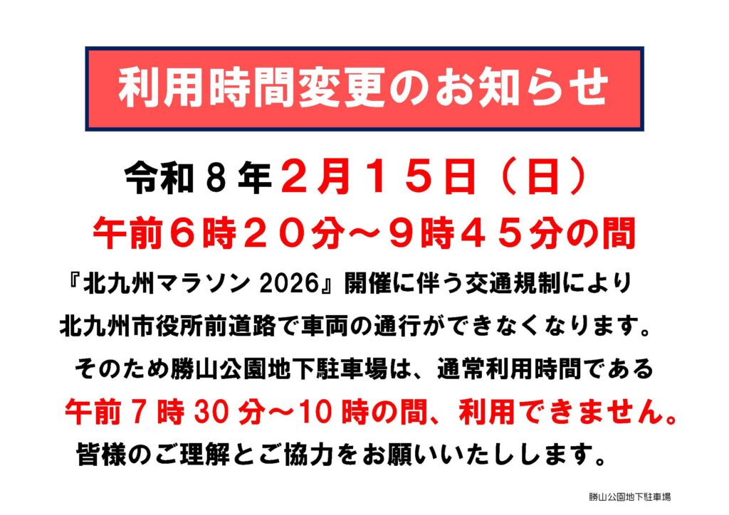 北九州マラソン開催に伴う市営勝山公園地下駐車場の営業時間変更について